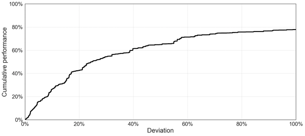 Figure 1 shows a typical cumulative performance plot. This figure in particular is based on the aggregated performance of flow rate measurements (MPFM or VFMs), from multiple assets around the world during real operations. We use the latest well test results (which are considered to be of high precision) as the reference values. To read the figure, start by picking a target deviation on the X-axis, e.g. 20%. From here, move in a vertical line upwards until the plotted line is reached. Thereafter, move in a horizontal line towards the Y-axis and read off the cumulative performance. If we look at e.g. 20% deviation, the cumulative performance is about 42%. This means that 42% of all the test points that have been evaluated obtained an error of 20% or less from their respective reference value. In this figure in particular, this means that the MPFM or VFM values deviated at most 20% from the (true) well test value in 42% of all the points in time where we did this performance test. The steeper this curve is and the sooner it reaches 100% on the Y-axis, the better the performance. The results shown in Figure 1 are noteworthy for several reasons.