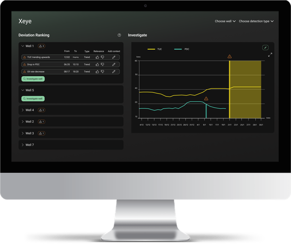 The dashboard displays all detected events for each well in a "Deviation Ranking" list. The ranking of the wells are based on a set of severity tags that monitors the degree of trending in the wells' production. For each event, associated information like type, start and end time is displayed. In addition, the user can mark events as relevant and add comments. When an event row is clicked, the event with the tag is plotted in the "Investigate" panel.